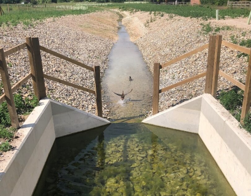 Advantage RSK Project Manager Sameer Shinh said: “The scheme has been designed to intercept and divert excess water from the Great Shefford Stream during periods of high water and will reduce the impact of flooding on 26 residential properties, seven commercial properties and the A338 Wantage Road. The excess will flow through a 648-metre underground concrete pipeline, a culvert system that runs beneath a farm track and then a newly created 138-metre open river channel that will safely release floodwater into the River Lambourn through a new confluence.